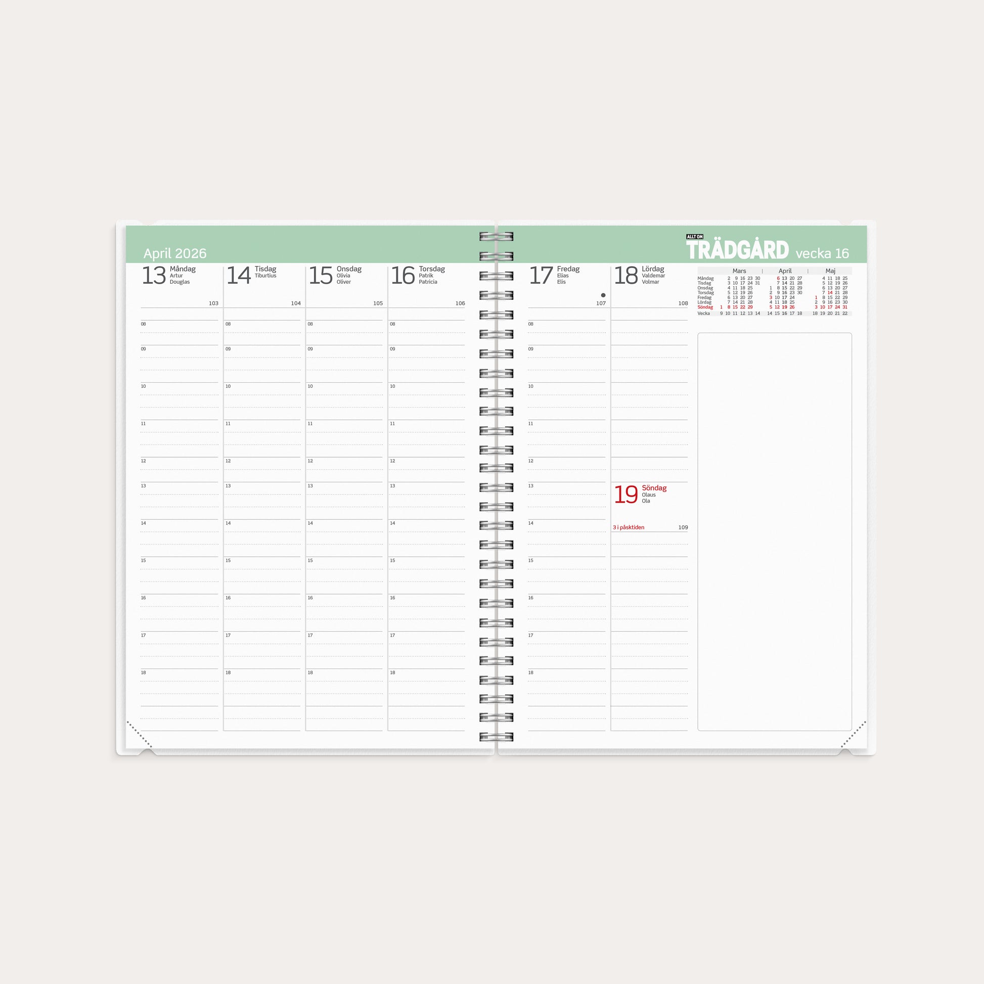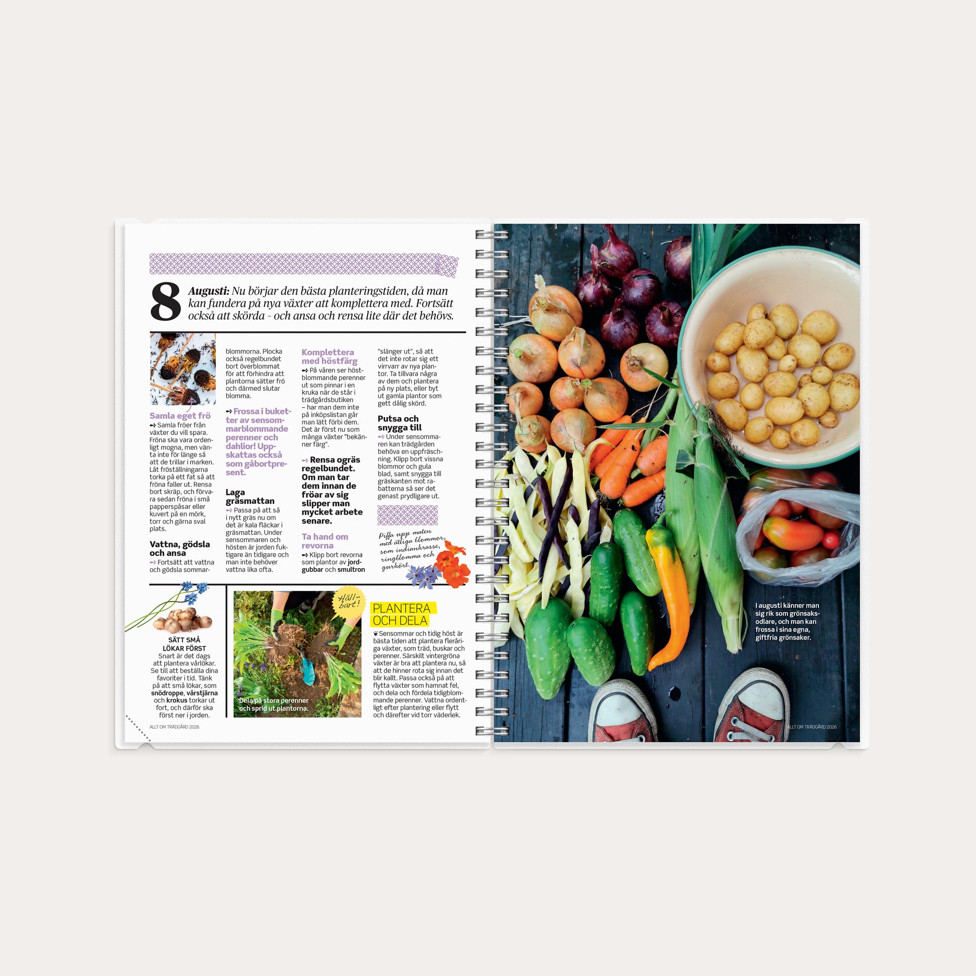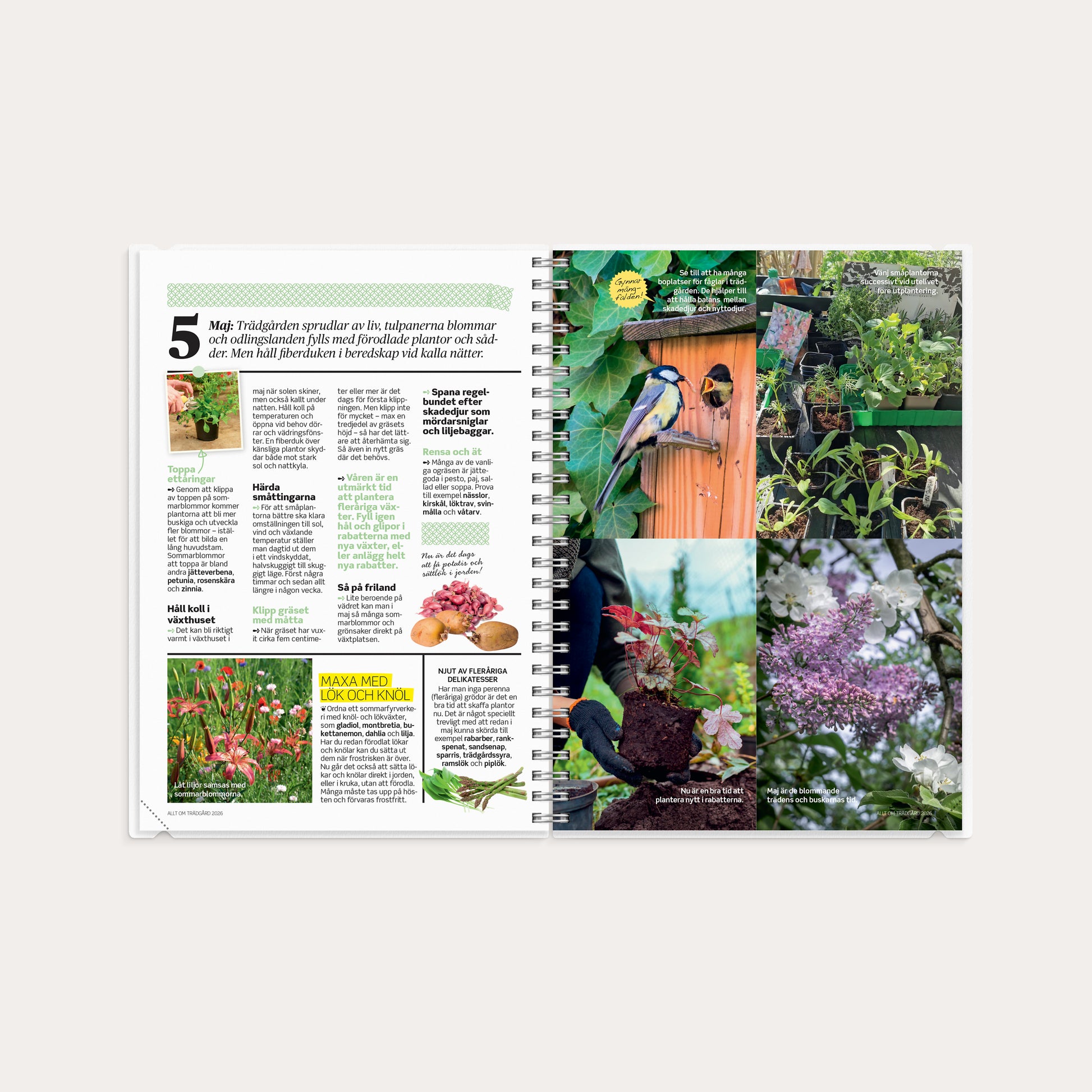 Tillsammans med tidningen Allt om Trädgård har Burde tagit fram en trädgårdskalender som hjälper dig att planera hela odlingsåret. Varje månad inleds med ett inspirerande uppslag där du får tips och påminnelser om vad som behöver göras i trädgården baserat på tiden på året, därefter följer vanlig klassisk veckoplanering. Det tåliga omslaget i plast gör att du kan ha med kalendern ut i odlingarna utan att innehållet skadas av jord och vatten. Planera smart och nå dina odlingsdrömmar!