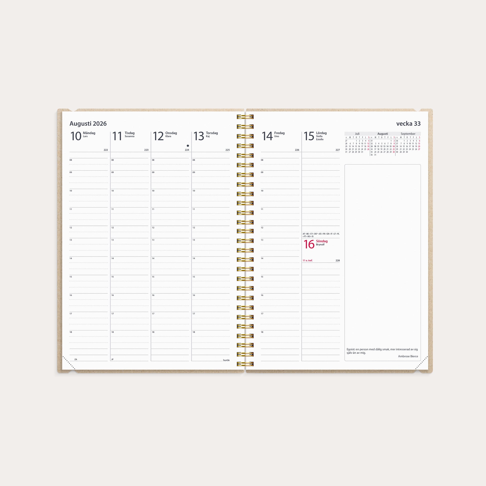 En kalender med ett omslag i återvunnen kartong och guldprägling. Att ha flyt på jobbet handlar till stor del om konsten att planera. Det här är kalendern för dig som vet att arbetsdagen lätt blir hektisk och snabbt fylls på med möten och uppgifter, och vill ha bra översikt över din veckoplanering. Klassisk stående inlaga med timindelning och årsplaner.