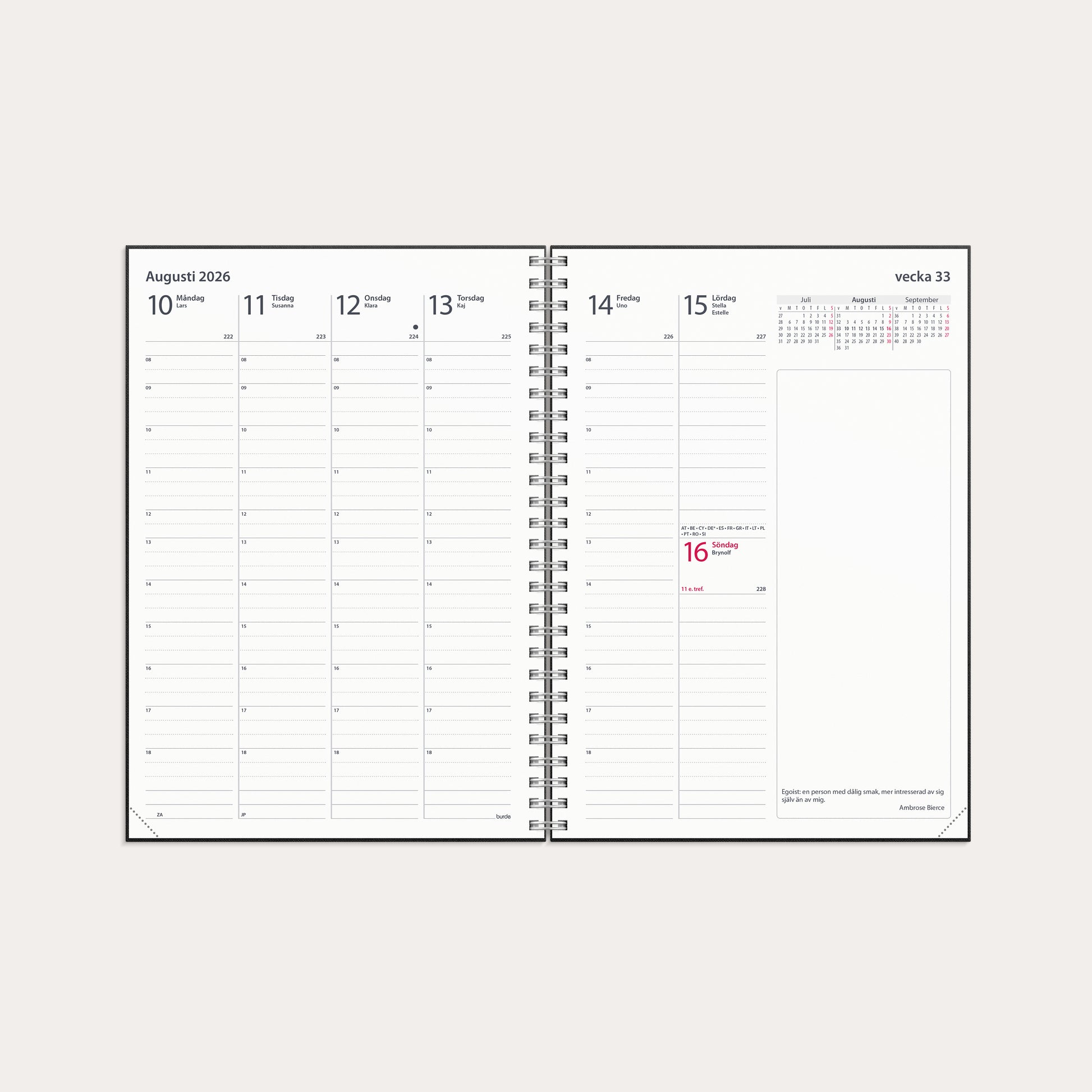 Detta textilomslag med det präglade årtalet ger ett stilrent och elegant intryck som passar året om. Att ha flyt på jobbet handlar till stor del om konsten att planera. Det här är kalendern för dig som vet att arbetsdagen lätt blir hektiskt och snabbt fylls på med möten och uppgifter, och vill ha bra översikt över din veckoplanering. När du vet vad som väntar varje dag blir du mer effektiv och chansen är större att du når dina karriärmål. Kalendern har även en praktisk förvaringsficka och tänkvärda citat.