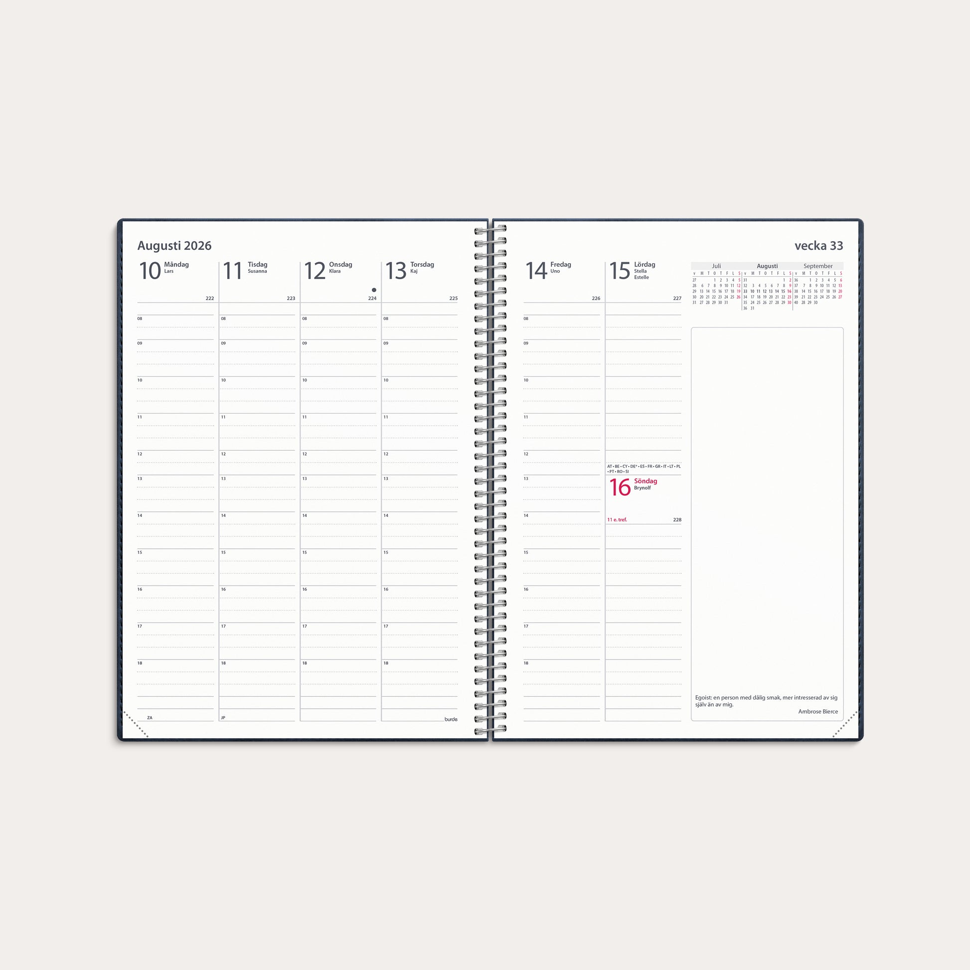 Kalender med mjuk pärm i konstläder med den populära flärpen som kan användas som bokmärke. Att ha flyt på jobbet handlar till stor del om konsten att planera. Det här är kalendern för dig som vet att arbetsdagen lätt blir hektiskt och snabbt fylls på med möten och uppgifter, och vill ha bra översikt över din veckoplanering. Klassisk stående inlaga med timindelning och årsplaner.