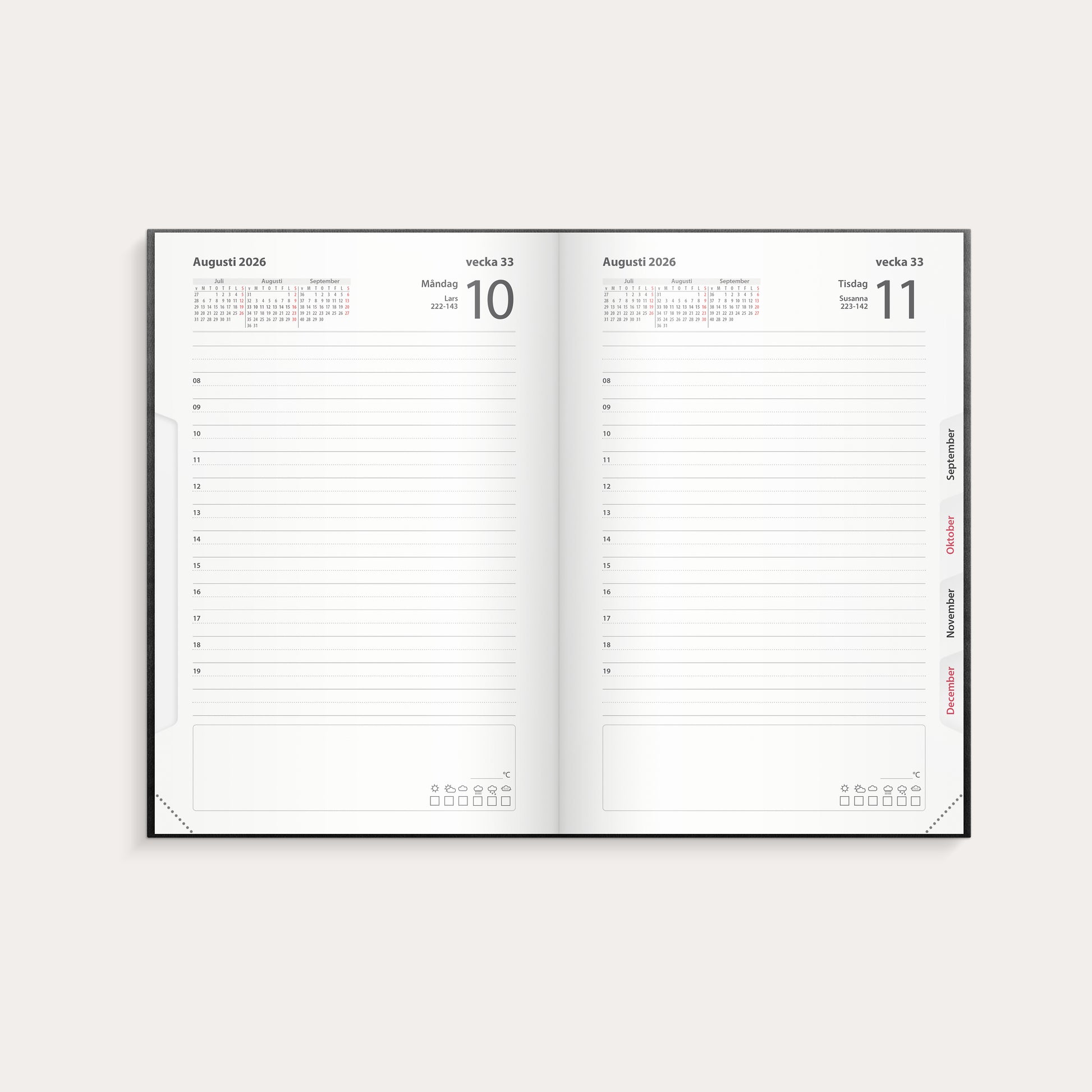 Inbunden kalender med dagboksinlaga i svart konstläder, som har en dag per sida med timindelning 8-19. Kalendern innehåller årsöversikter, årsplaner, urstansat månadsregister samt har märkband.