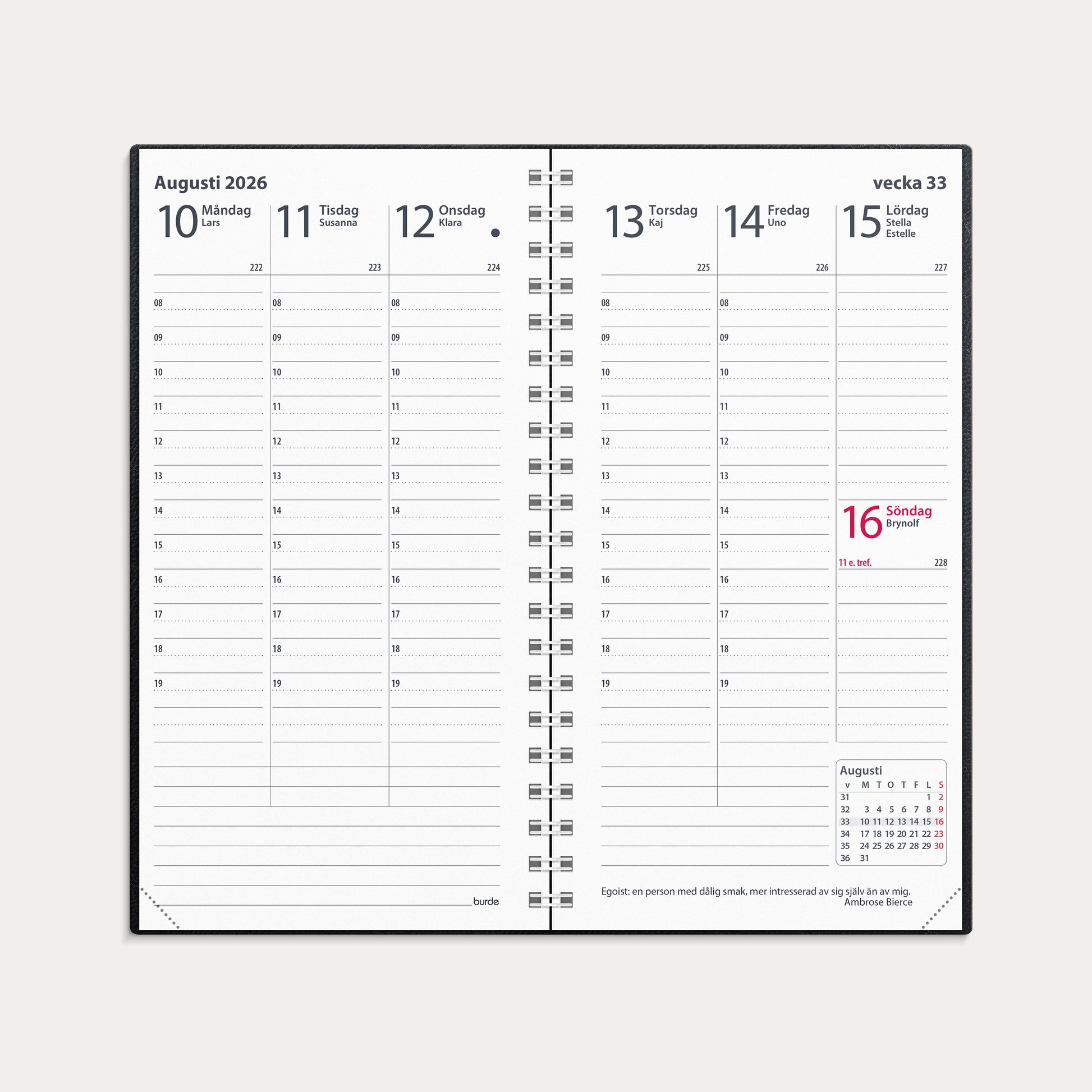 Interplano II svart skinn är en fickkalender med 18 månaders kalendarie, stående veckouppslag och timindelning 8-19. Svart avtagbart omslag av skinn. Kalendern innehåller årsöversikter, årsplaner, anteckningshäfte och atlas.