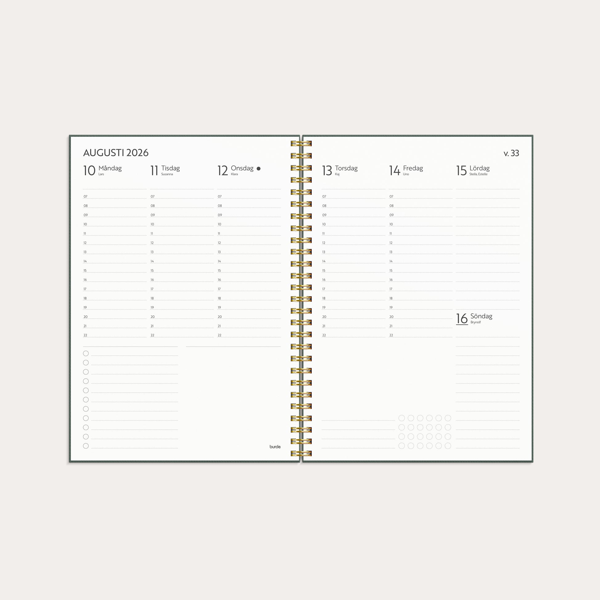 Stilren kalender som har det som behövs för att planera veckan och få ordning på vardagslivet. Tydliga klockslag, 7-22, gör att du lätt kan planera in rätt tider för aktiviteter och kom ihåg. Kalendern är neutral i svartvita färger.