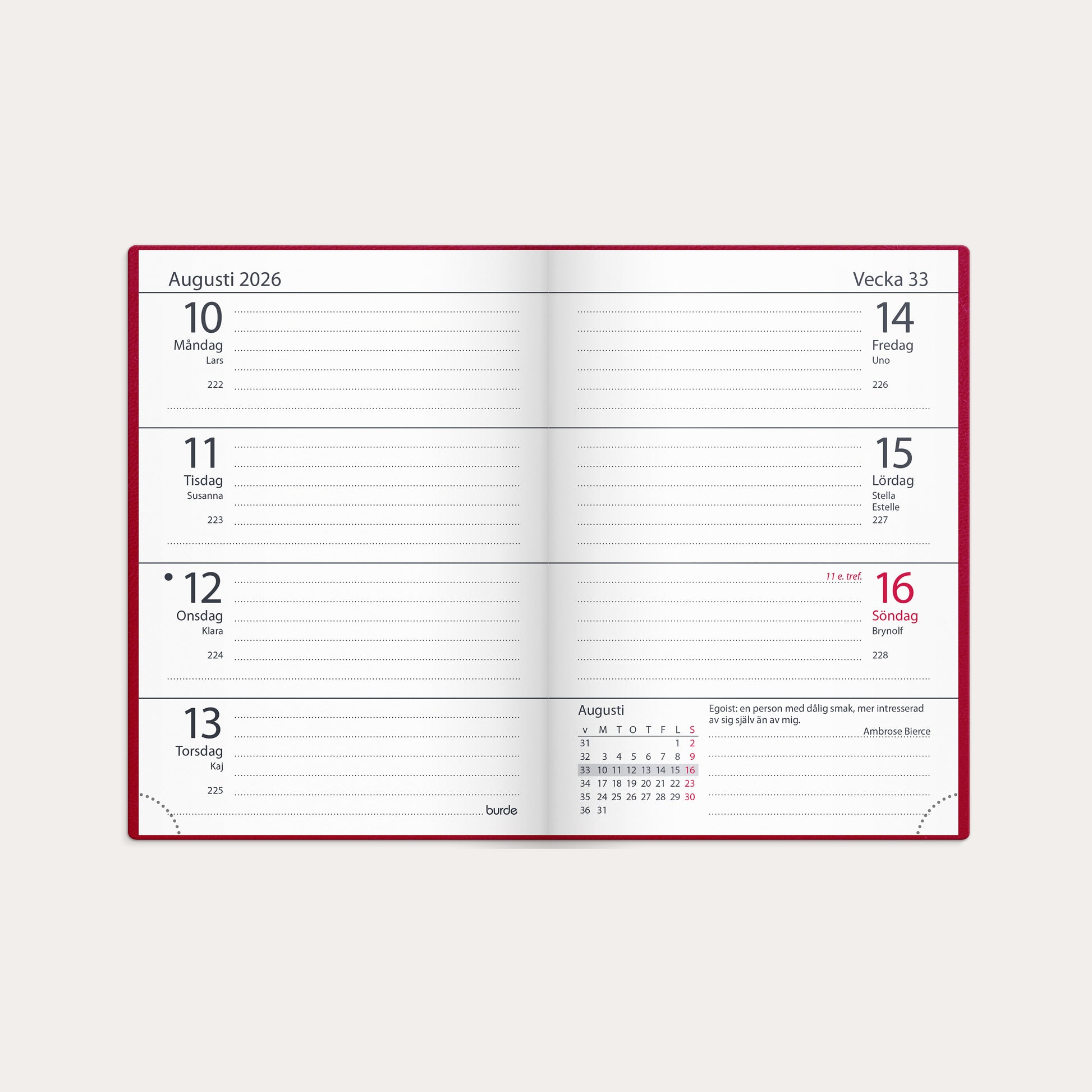 illa Fickdagboken rött konstläder är en liten fickkalender med liggande veckouppslag. Inbunden fickkalender med årsöversikt, årsplan, telefonregister och atlas.