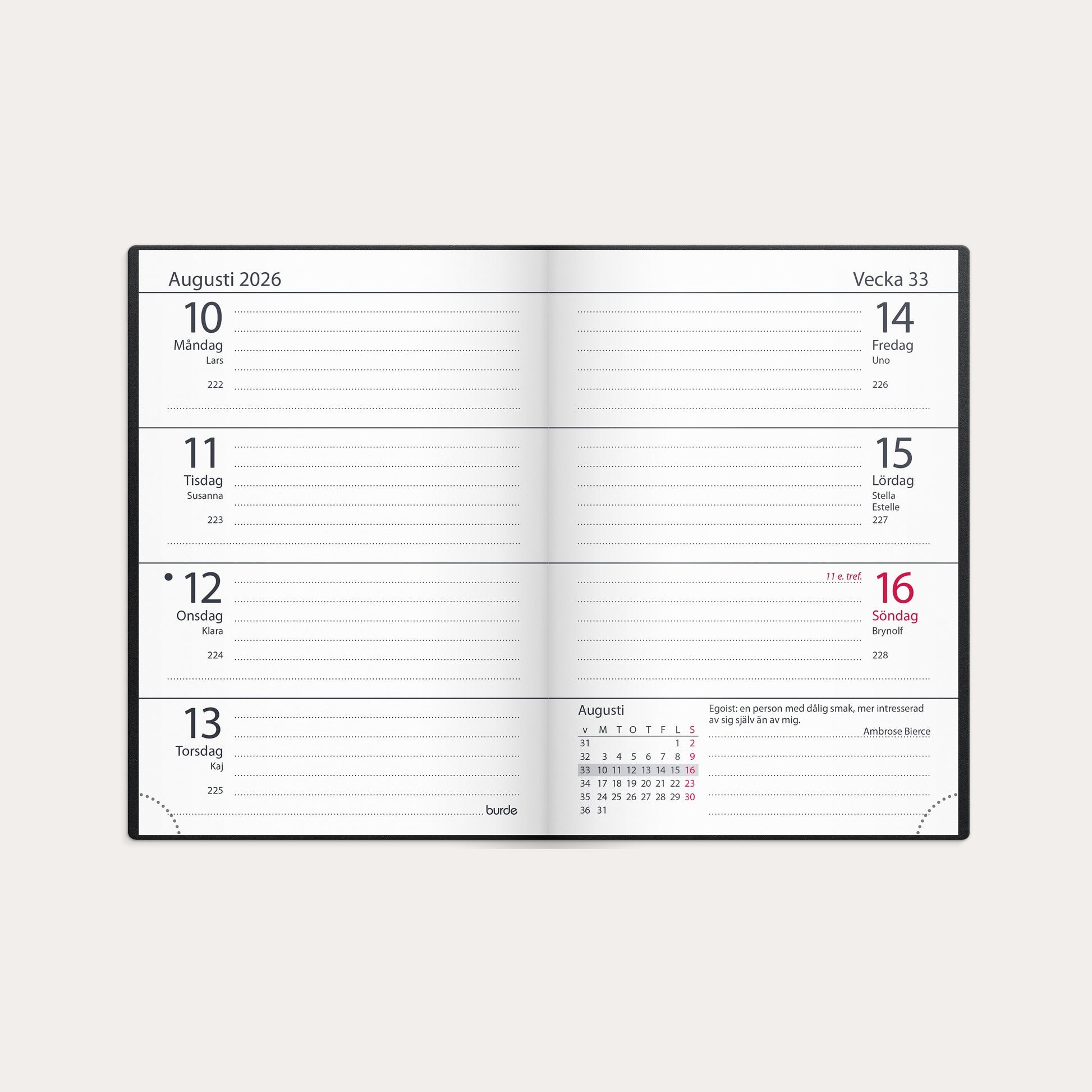 Lilla Fickdagboken svart plast är en liten fickkalender med liggande veckouppslag. Kalendern innehåller årsöversikt, årsplan, telefonregister och atlas.