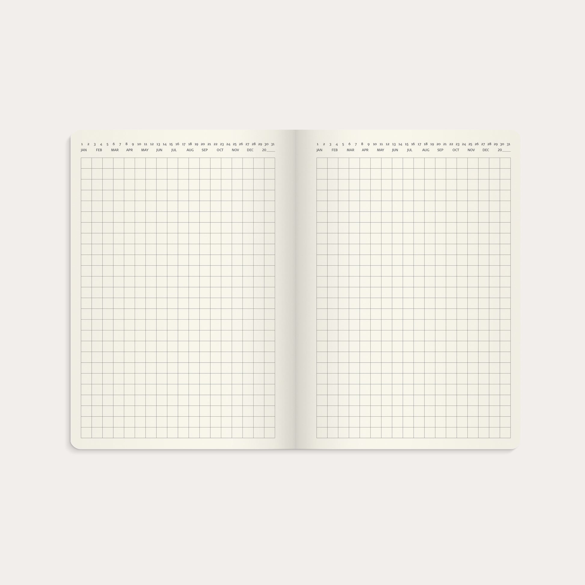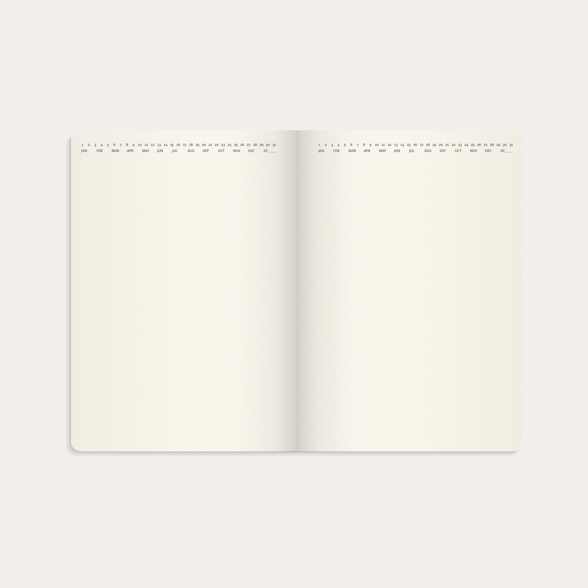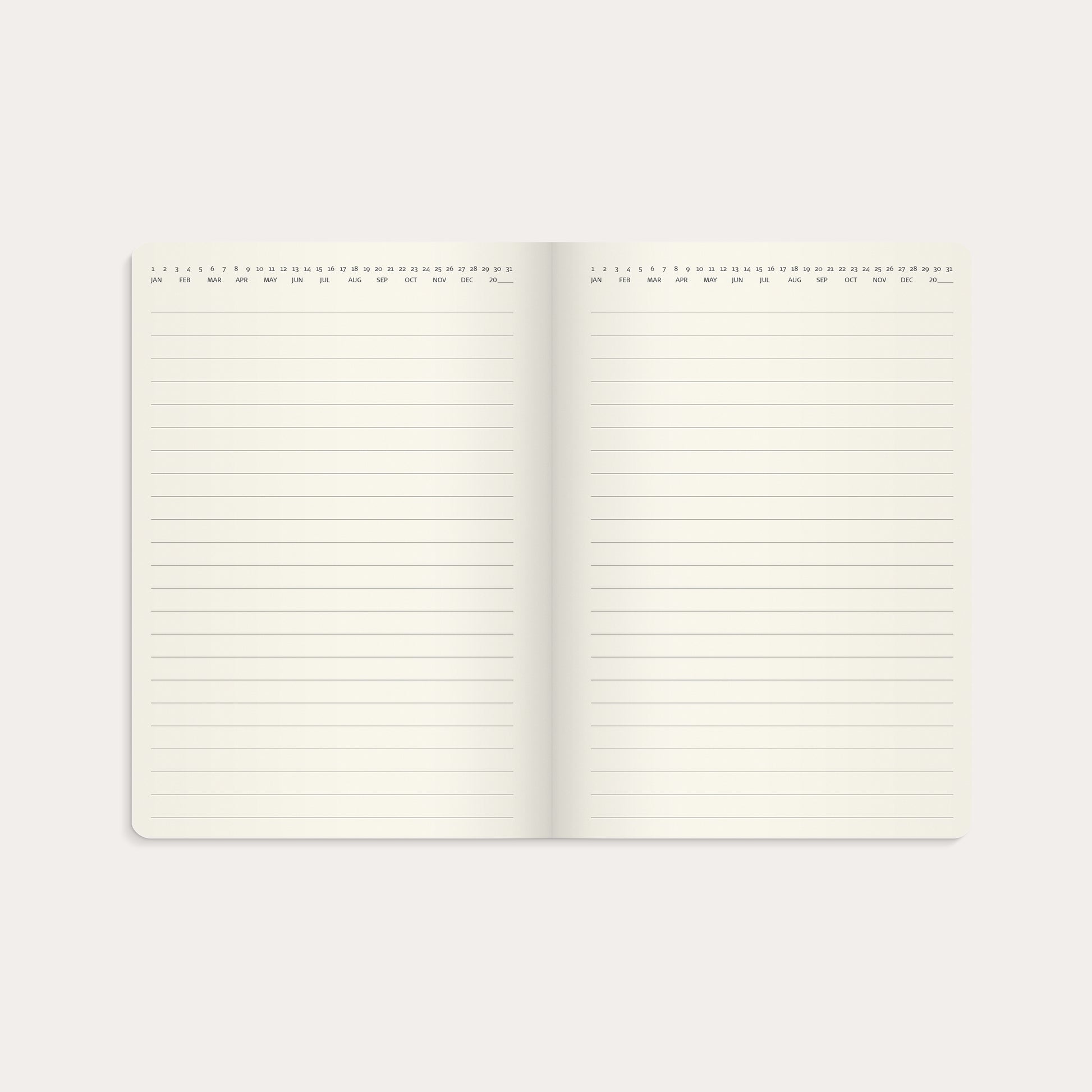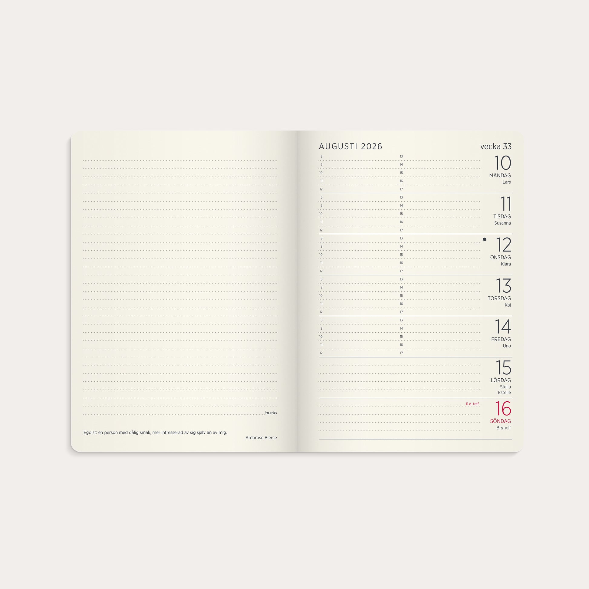 En stilren och exklusiv kalender där fokus ligger på tydlig veckoplanering. Inlagan har ett praktiskt uppslag där högersidan har veckoplanering med liggande layout och timindelning 08-17 och vänstersidan är linjerad för anteckningar. I slutet hittar du 48 extra sidor för anteckningar. Pappret är klassiskt cremefärgat.
