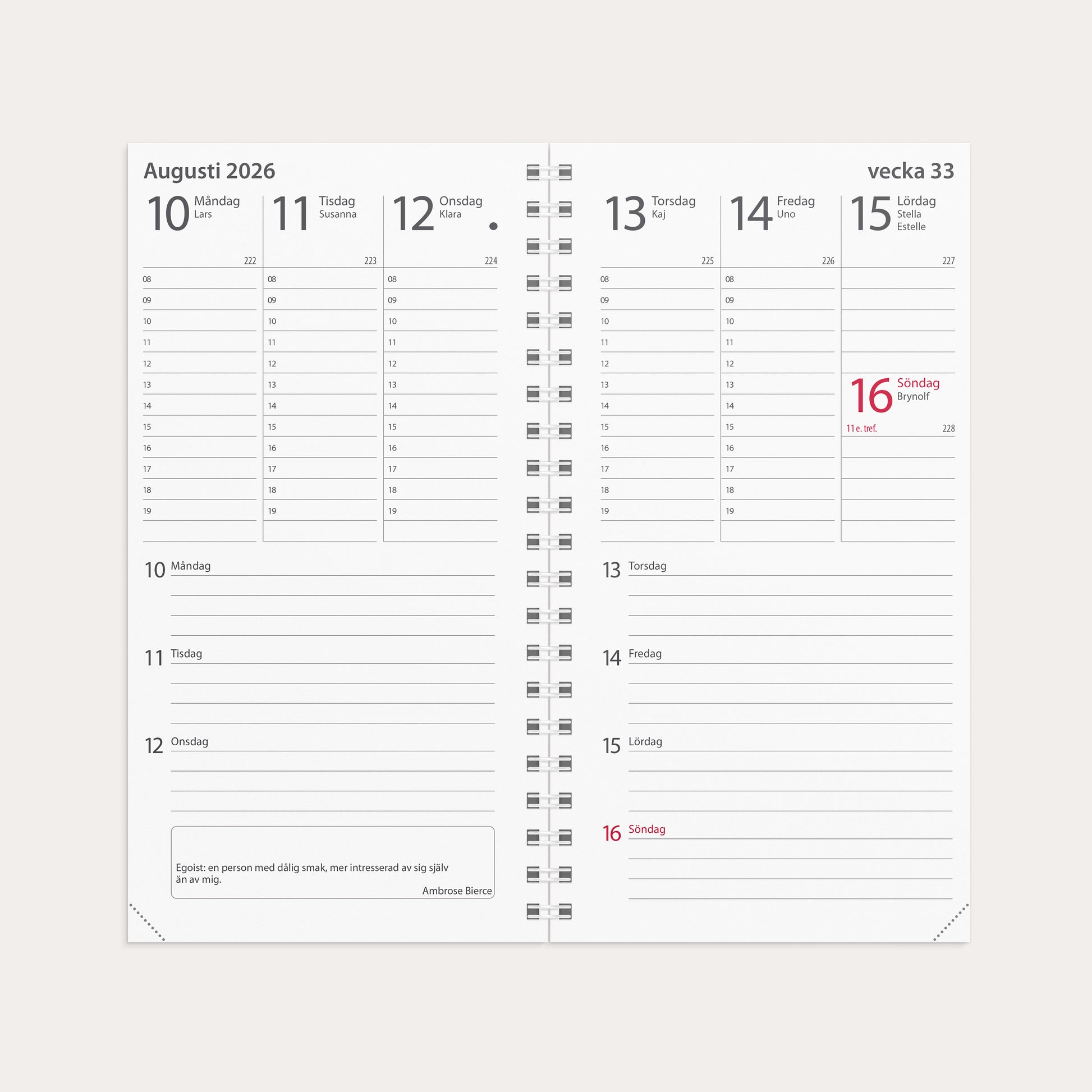 Minister refill är en kalenderrefill till fickkalender Minister. Kalendern har veckouppslag med timindelning 8-19 och innehåller årsöversikter samt årsplaner.