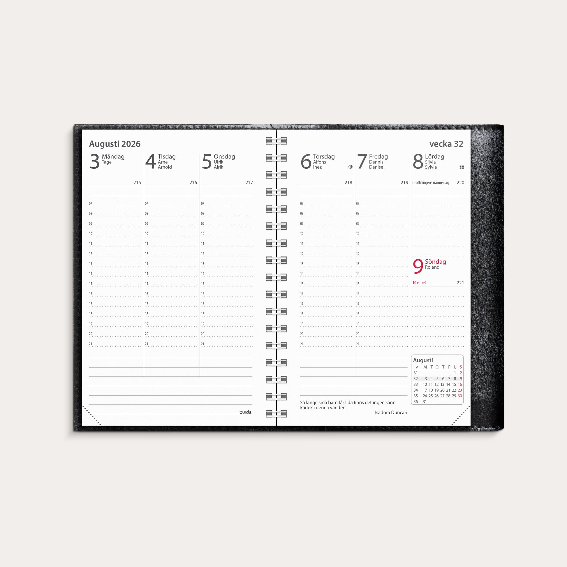Prestige de Luxe är en exklusiv fickkalender med tredelat skinnomslag. Kalendern har stående veckouppslag med timindelning 7-21. Kalendern är spiralbunden och innehåller årsöversikter, årsplaner, anteckningsbok, telefonregister samt atlas.