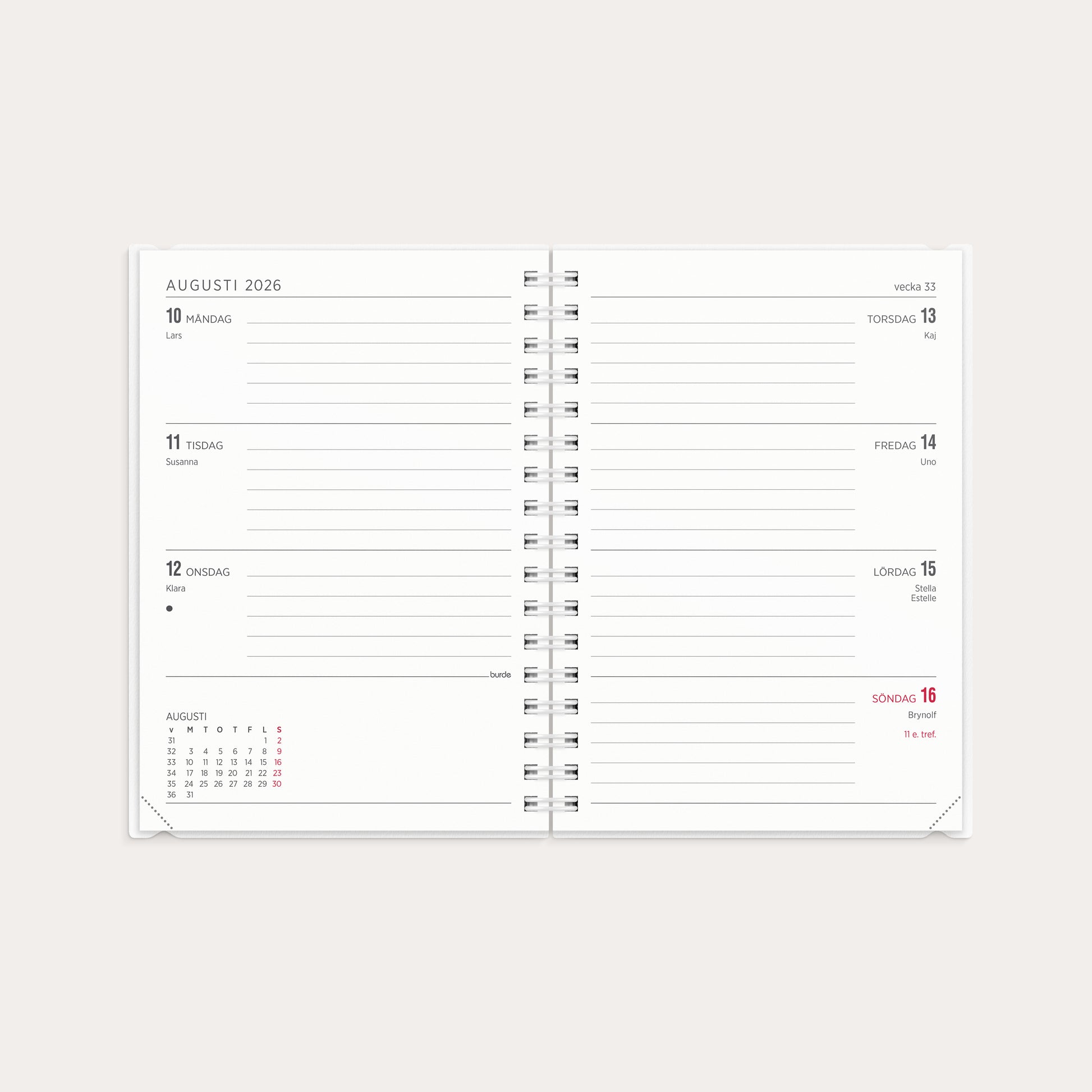 Framsidan kan du ändra året om, kalendern innehåller fyra motiv som du lätt kan byta mellan eller varför inte skapa ett eget? För att detta ska vara möjligt och fortsatt vara ett praktiskt omslag så är omslaget gjort i plast. Ett klassiskt uppslag med liggande layout där fokus ligger på tydlig veckoplanering. Inlagan passar dig som har mycket på gång, oavsett veckodag. Kalendern är liten och enkel och med lika mycket utrymme för både vardag och helg.