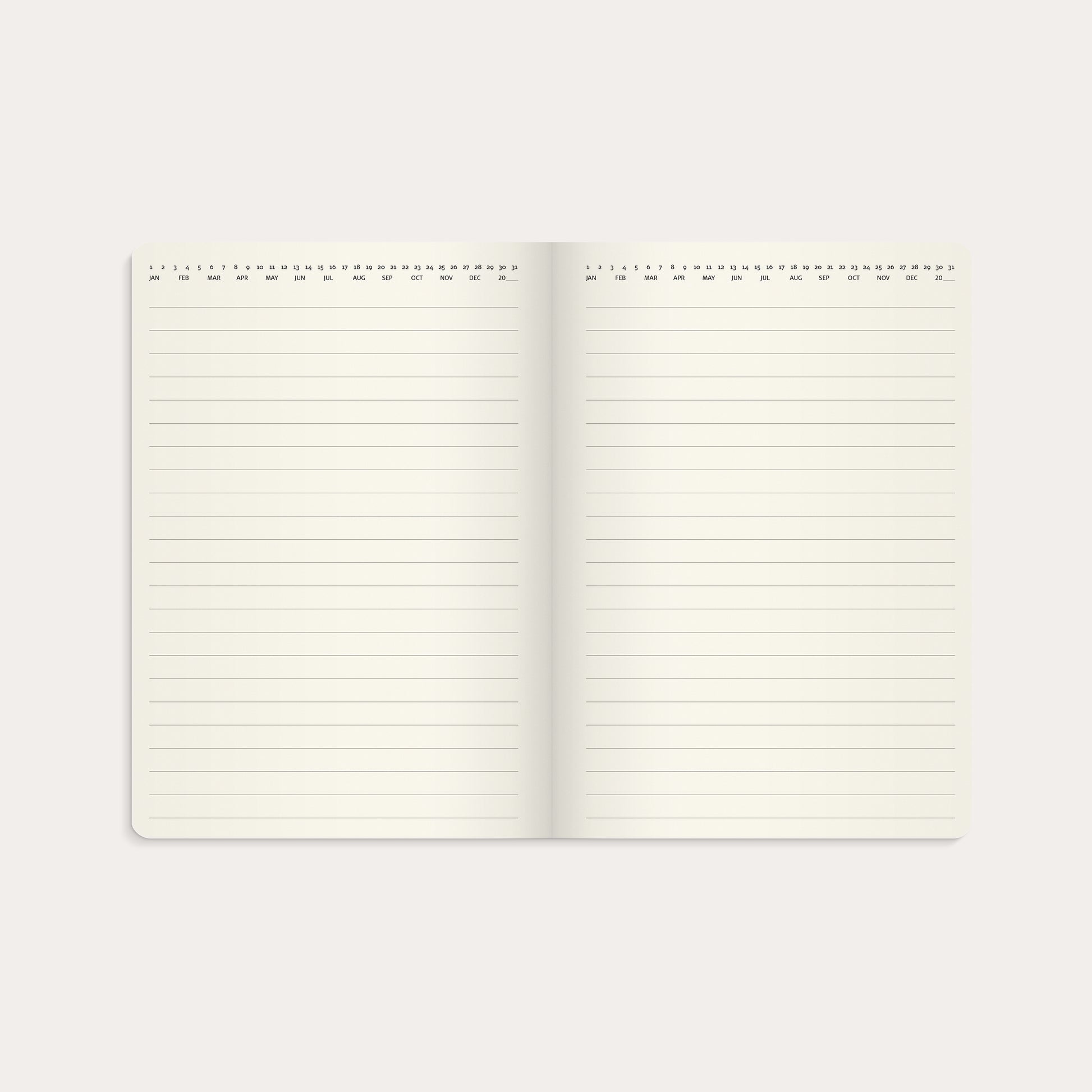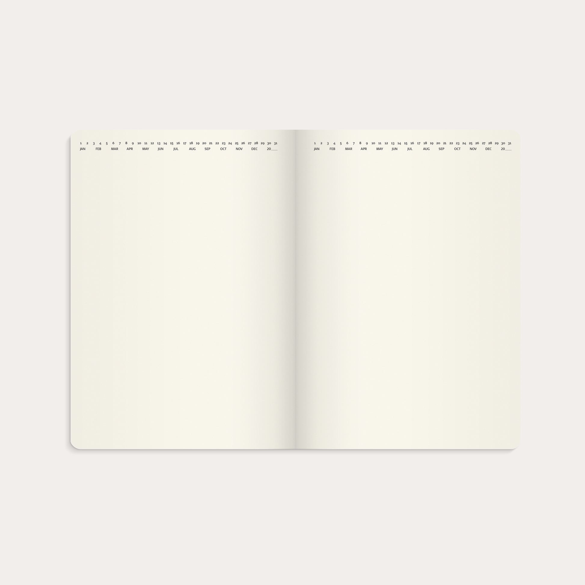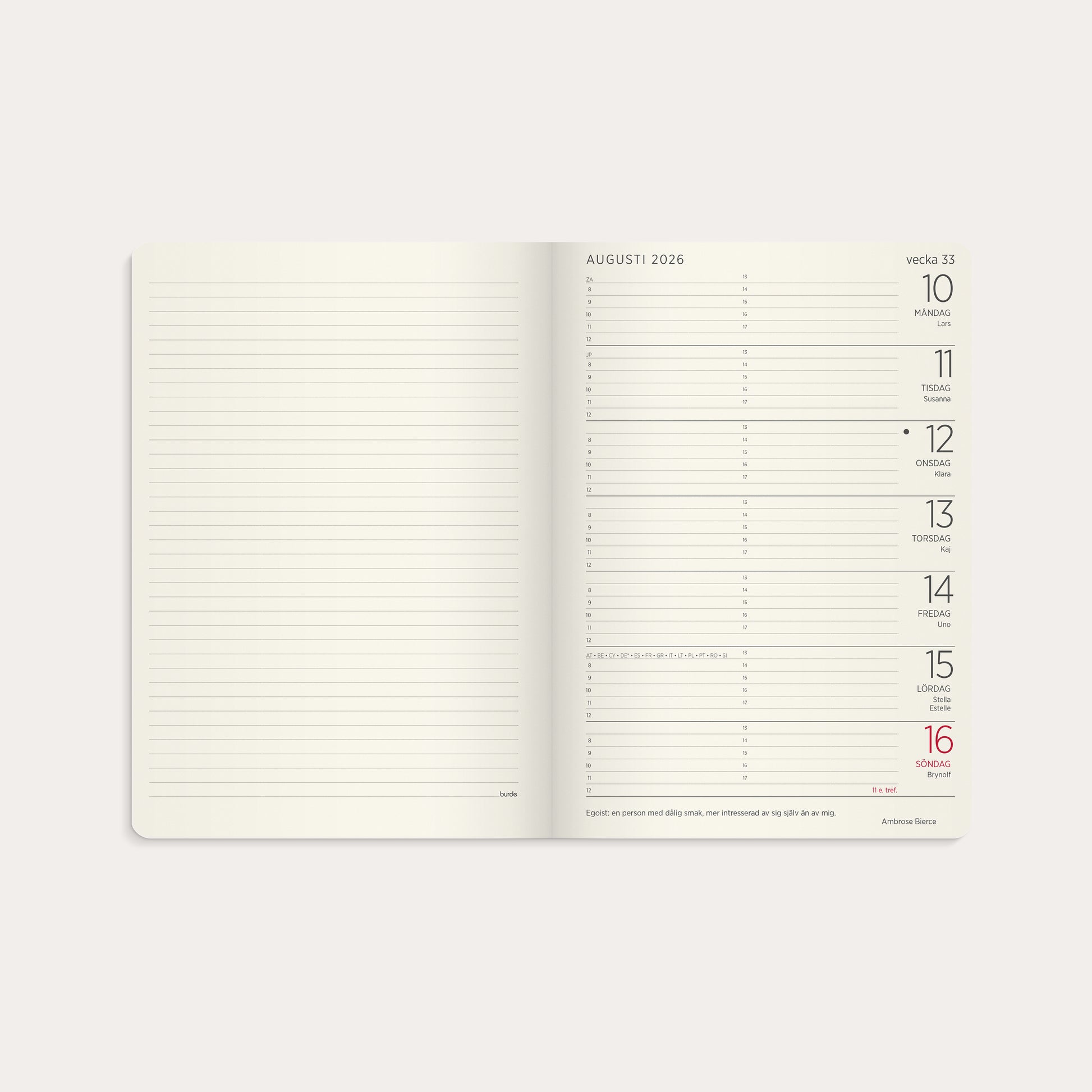 En stilren och exklusiv kalender där fokus ligger på tydlig veckoplanering. En klassisk kalender med cremefärgat papper och med en vecka per uppslag, där vänstersidan har linjerade sidor för anteckningar och högersidan timindelning 08-17. I slutet hittar du 64 extra sidor för anteckningar och en lättöverskådlig årsplanering. Enkelt och tydligt med fokus på det viktigaste!