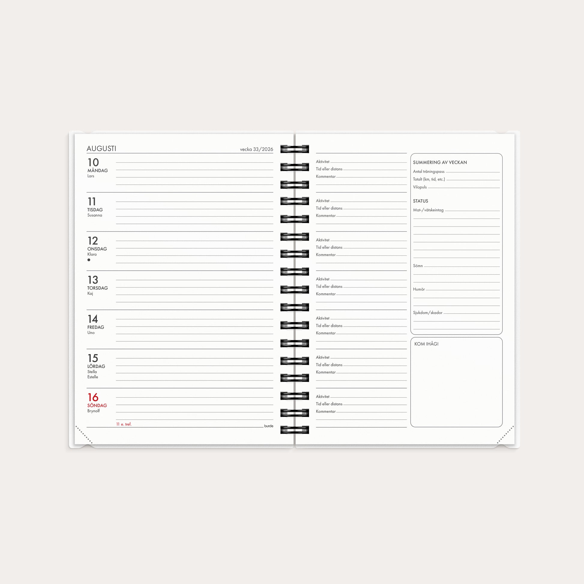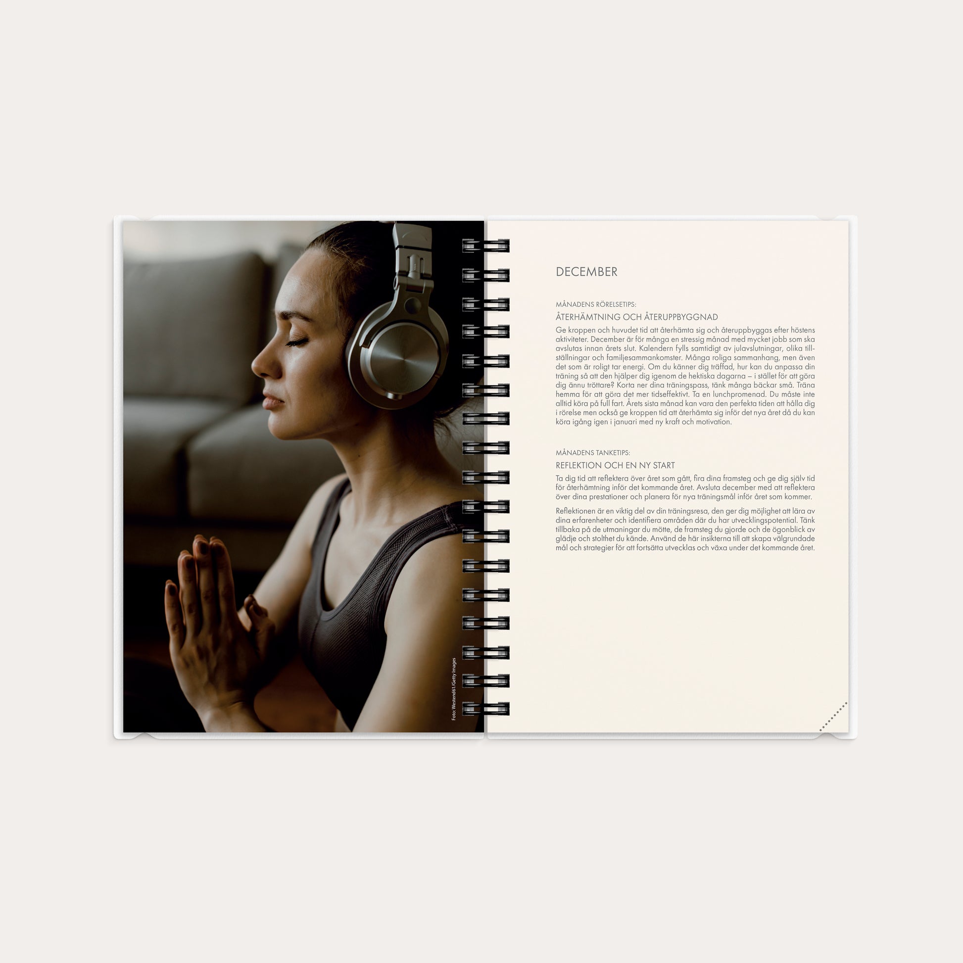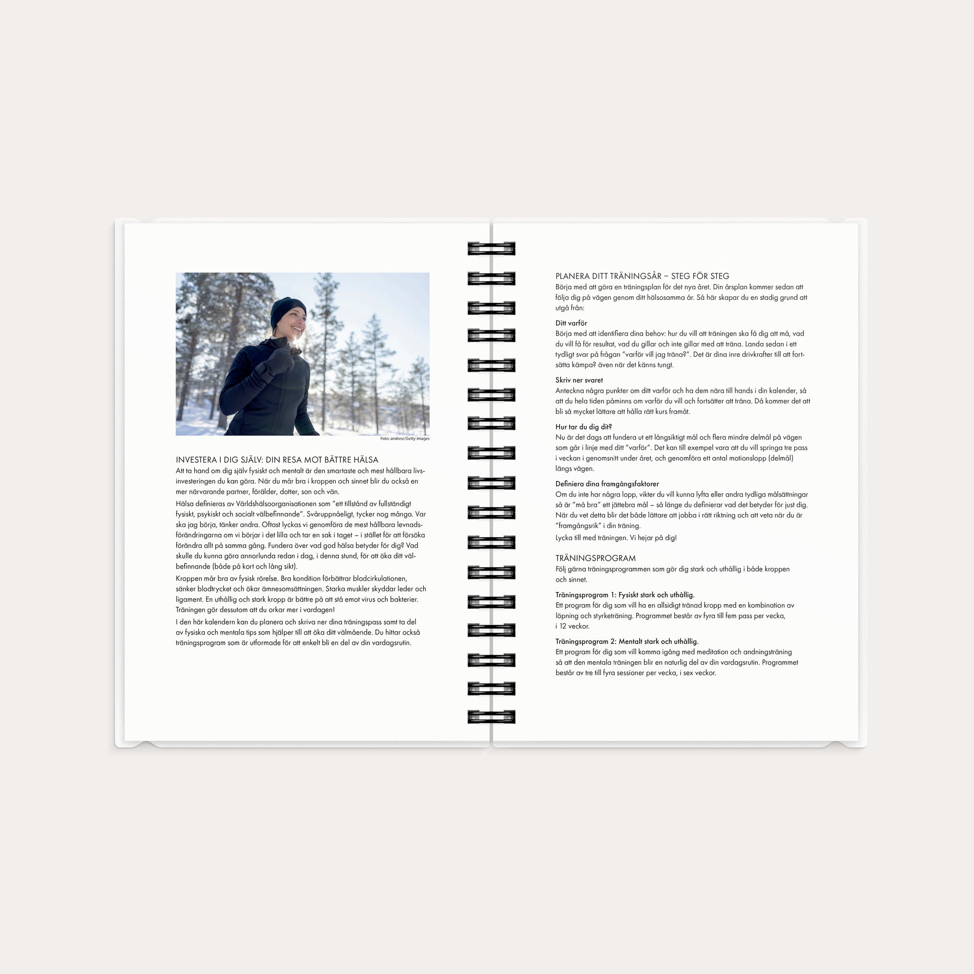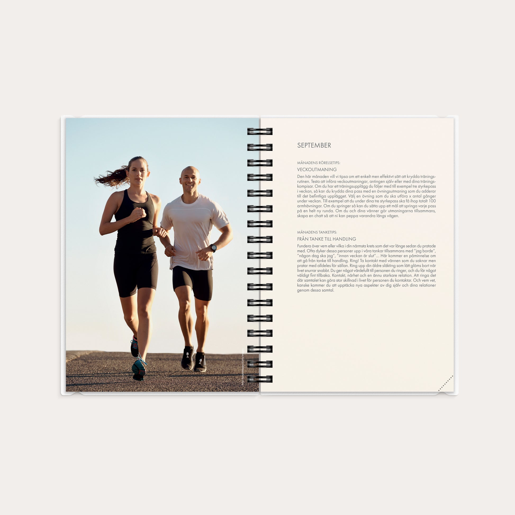 Träningskalendern hjälper dig att få sunda vanor i din vardag, men även att behålla dem över tid. Kalendern passar dig som vill ha en allsidig träning med en kombination av löpning och styrketräning. Det ingår även ett program för dig som vill komma i gång med meditation och andningsövningar så att den mentala träningen blir en naturlig del av din vardag också. Båda programmen är signerade löpcoachen och PT:n Jenny Sunding. Jenny ger också hälsosamma tips som håller inspirationen vid liv hela året. På varje uppslag finns dels en kalendersida med veckoplanering och dels en aktivitetssida. Träningskalendern har ett funktionellt plastomslag för att kunna följa med dig på träningspassen och även 2 framsidor att växla mellan.