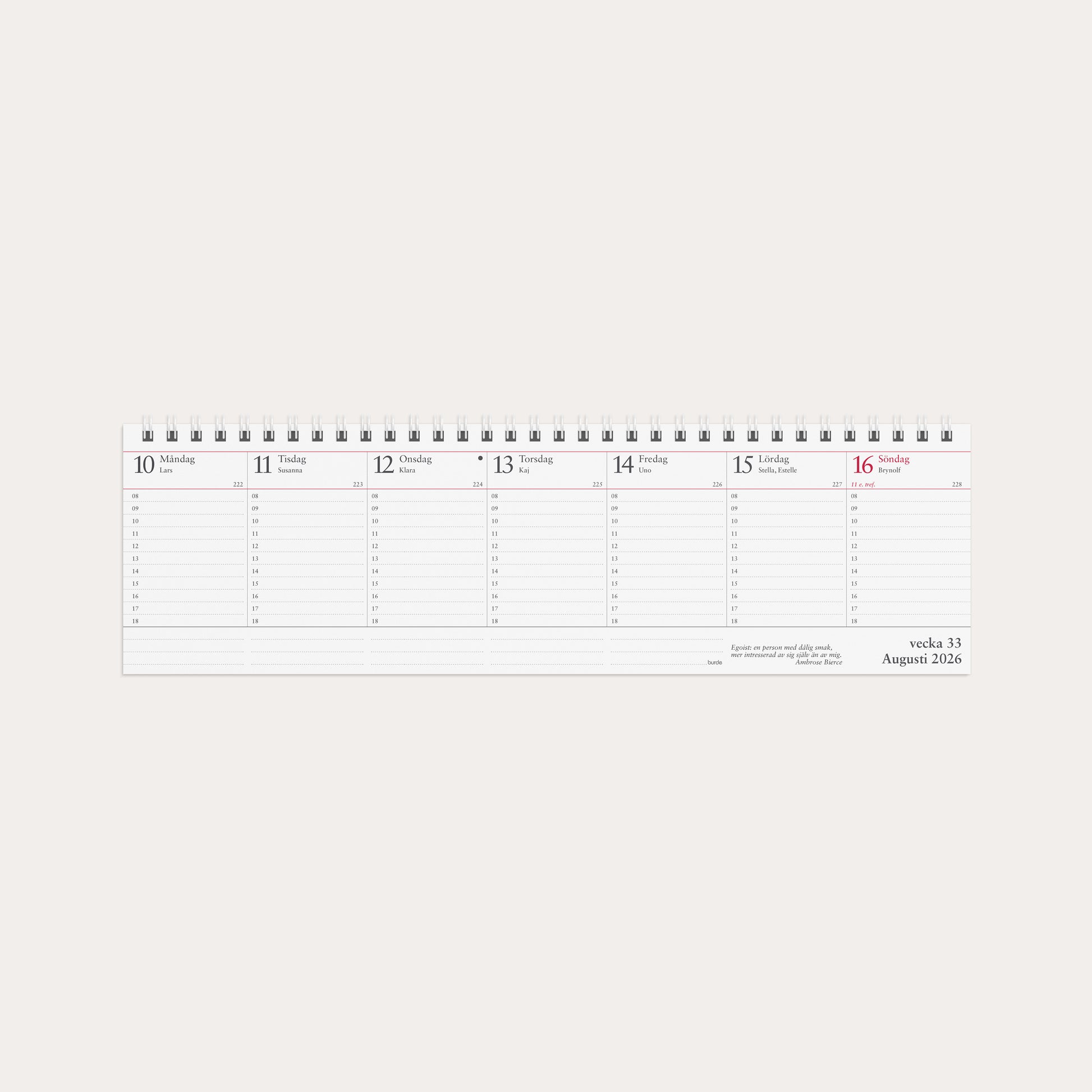 Veckoalmanackan används som bordskalender. Stående veckouppslag med timindelning 8-18 samt årsöversikter.