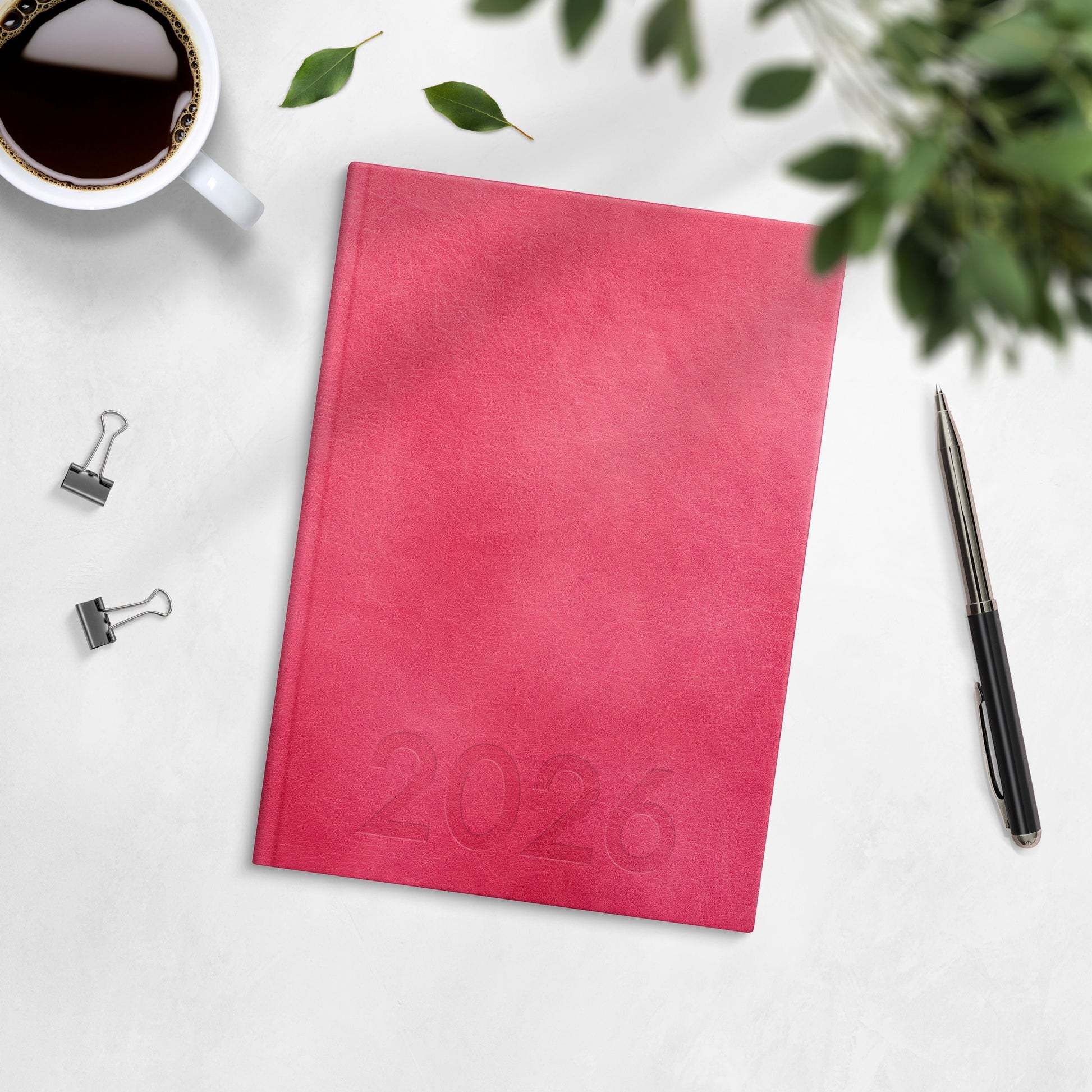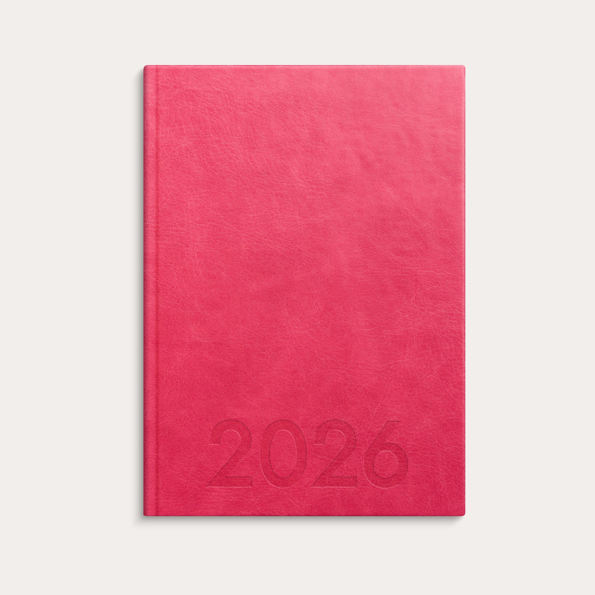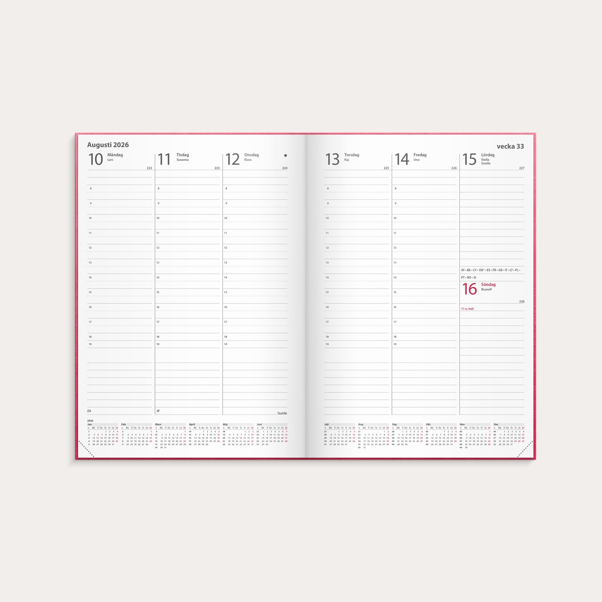 Kalender med stående veckouppslag, timindelning 08-19 samt årsöversikt på varje uppslag. Weekly konstläder är inbunden samt innehåller årsöversikter, årsplaner, märkband och internationella helgdagar.