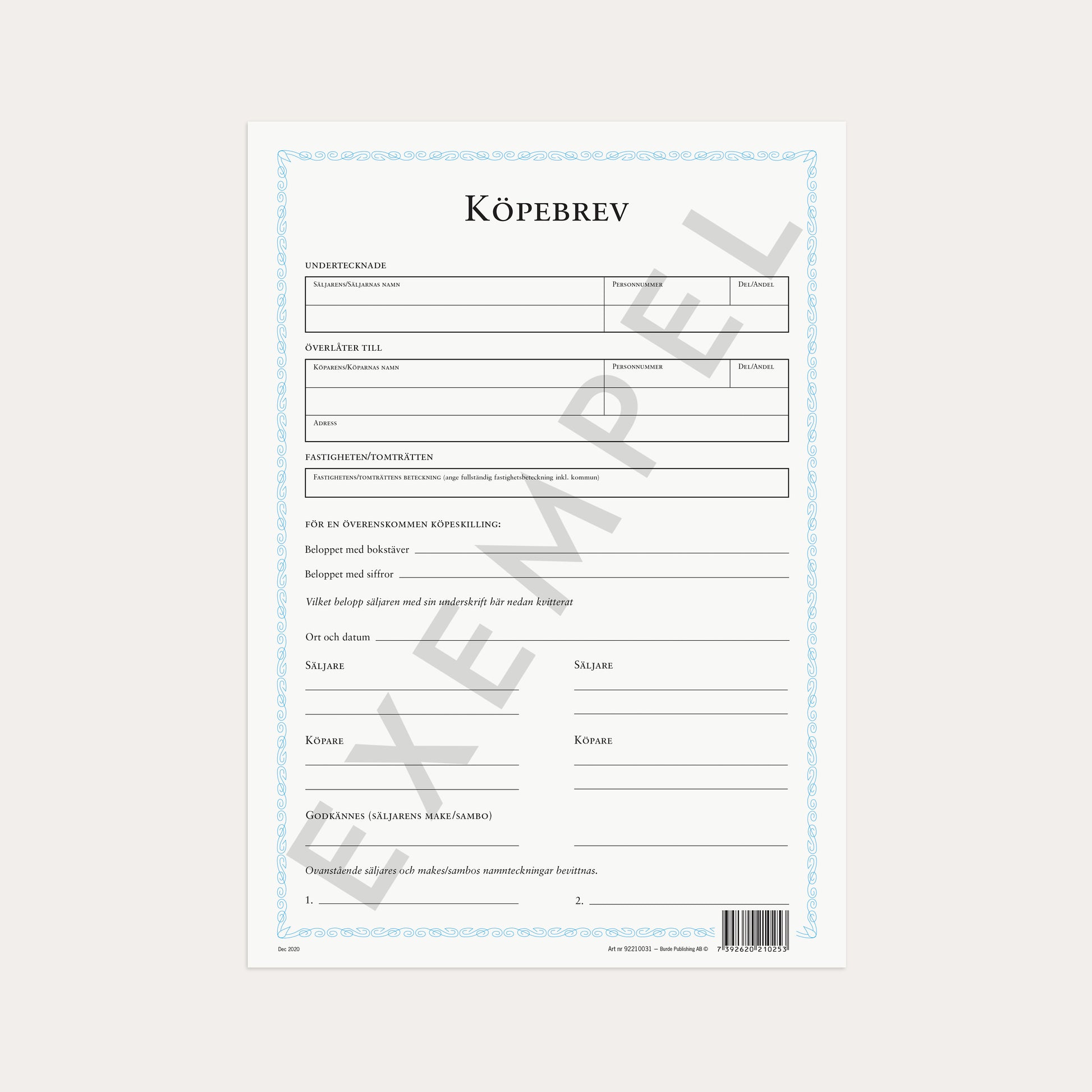 Blankett. Köpebrevet innehåller de obligatoriska uppgifterna för att användas vid lagfartsansökan. FSC®. Format: A4