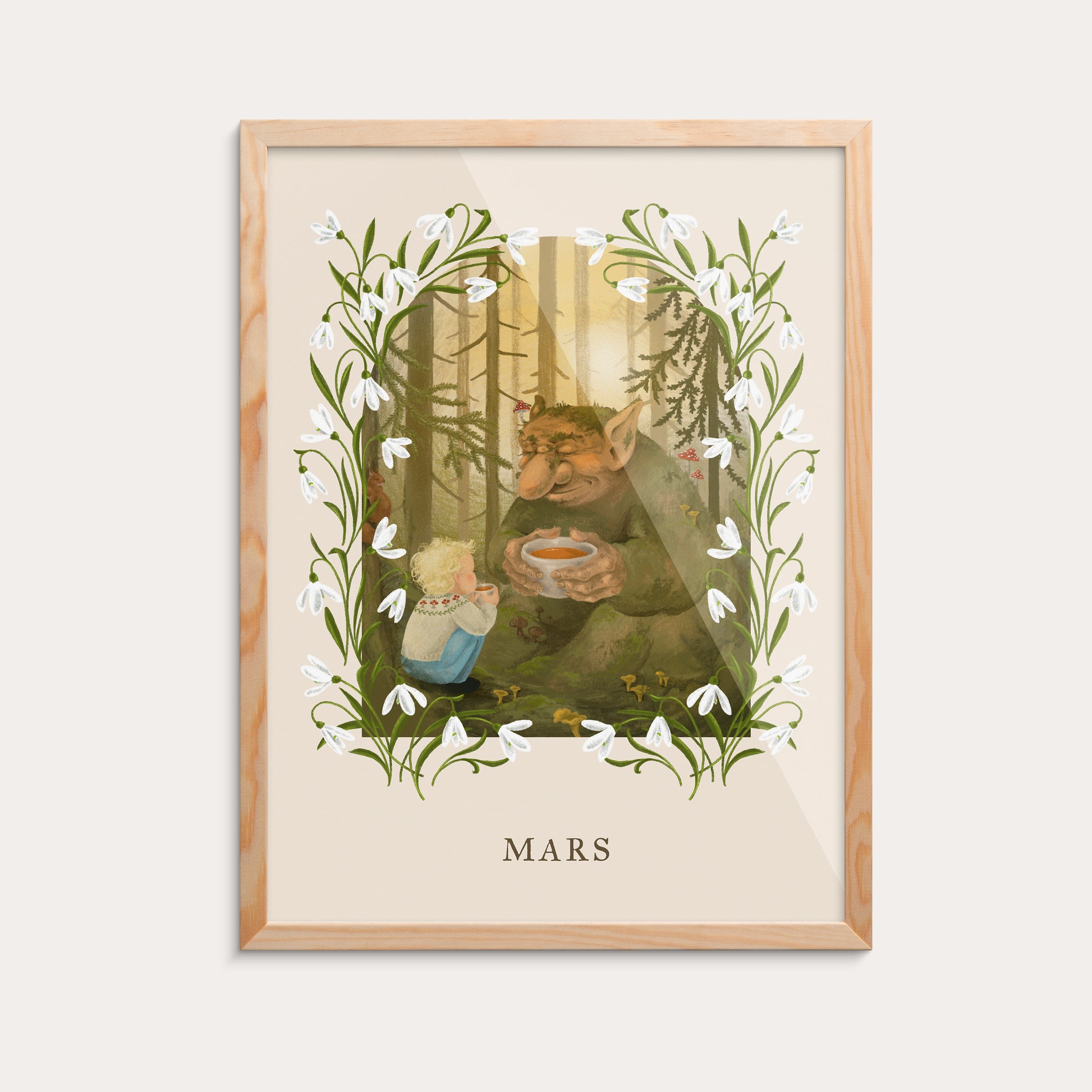 Månadstavla Sagoskog. En serie förtrollande handritade månadsillustrationer som skildrar årets månader i en magisk sagoskog. Varje tavla fångar månadens karaktär med naturens växlingar, magiska väsen och små berättelser inbäddade i motiven. Tryckta på 150 g högkvalitativt papper och perfekta för barnrum eller som en samlarserie genom året. Träfärgad träram med plexiskiva. Format: 300 x 400 mm.