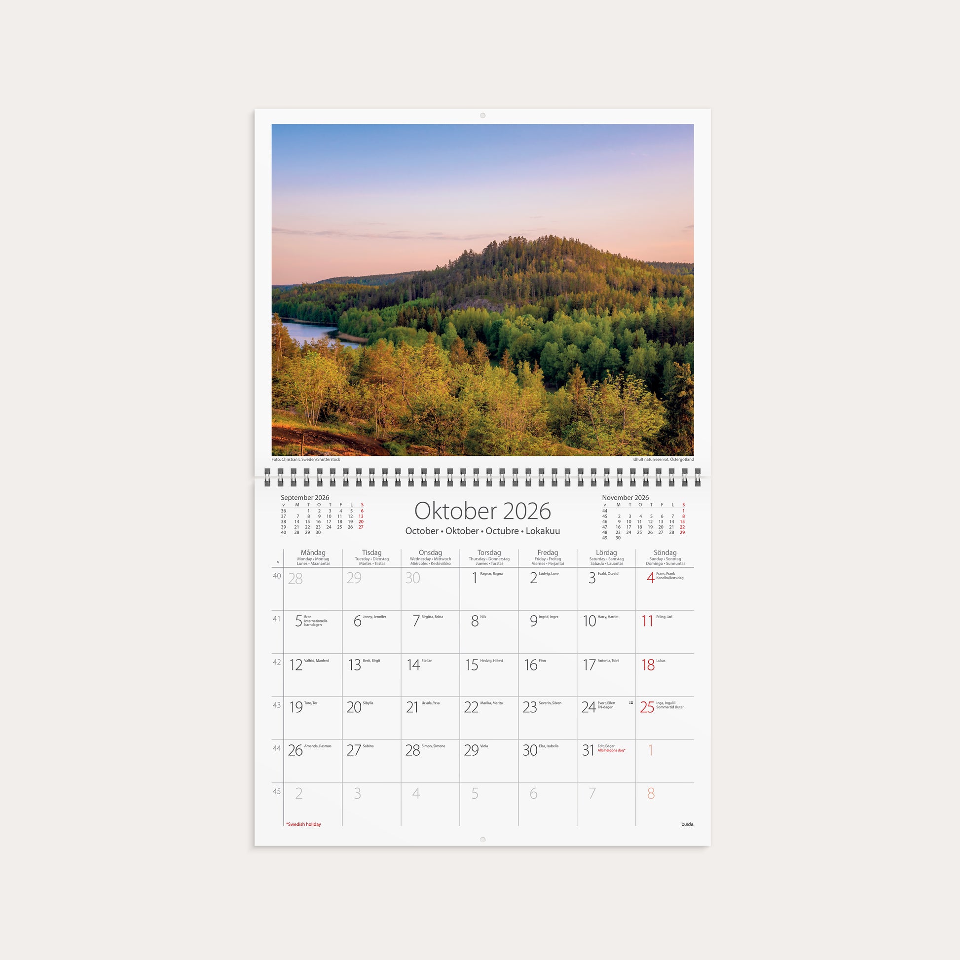 Väggkalender med tolv fina bilder från svensk natur, den är femspråkig (svenska, engelska, tyska, spanska och finska) och har svenska namnsdagar. Ett kuvert följer med så väggkalendern lätt kan skickas iväg som en fin present!