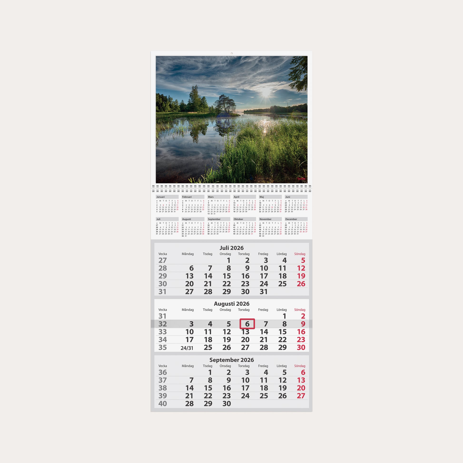 Väggkalender med tre månaders kalendarium på varje blad med innevarande månad i mitten. Flyttbar datummarkering.